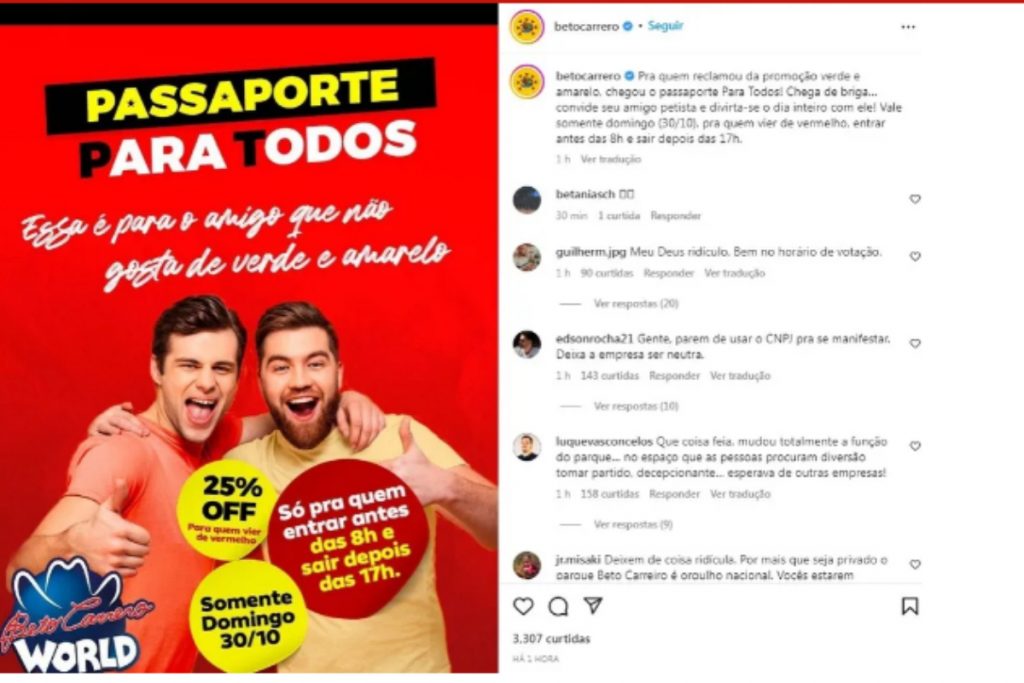 Em outubro deste ano, foi a vez de Beto Carrero World, em Santa Catarina, ficar na mira dos consumidores. Em época de eleições presidenciais no país, o parque ofereceu um desconto de 25% a quem fosse vestido de vermelho e permanecesse no local durante todo o horário de votação, das 8h às 17h, no domingo, 30. A Justiça Eleitoral recebeu na época cerca de 150 denúncias sobre a promoção que incentivava a abstenção de petistas. Em nota, o PT informou que havia entrado com notícia-crime na Procuradoria-Geral da República.