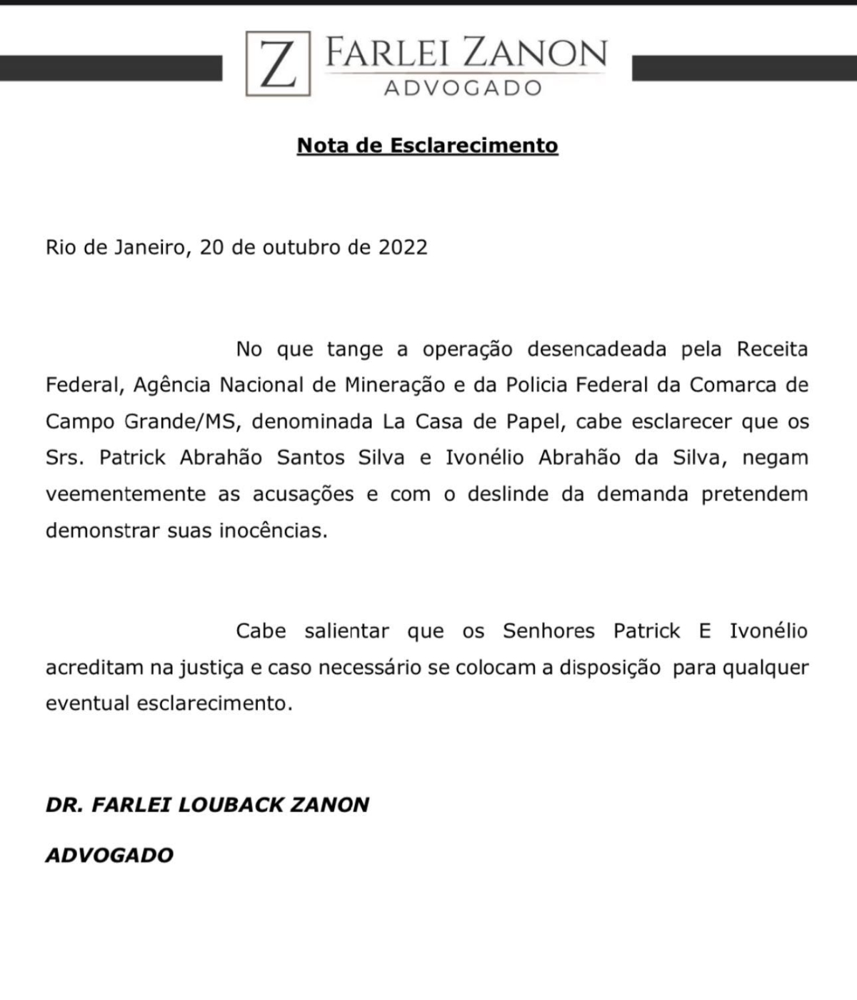 A ex-fankeira compartilhou nas redes um comunicado assinado pelos advogados do companheiro. “No que tange à operação desencadeada pela Receita Federal, Agência Nacional de Mineração e da Polícia Federal da Comarca de Campo Grande / MS, denominada La Casa de Papel, cabe esclarecer que os Srs. Patrick Abrahão Santos Silva e Ivonélio Abrahão da Silva negam veementemente as acusações e com o deslinde da demanda pretendem demonstrar as suas inocências”.