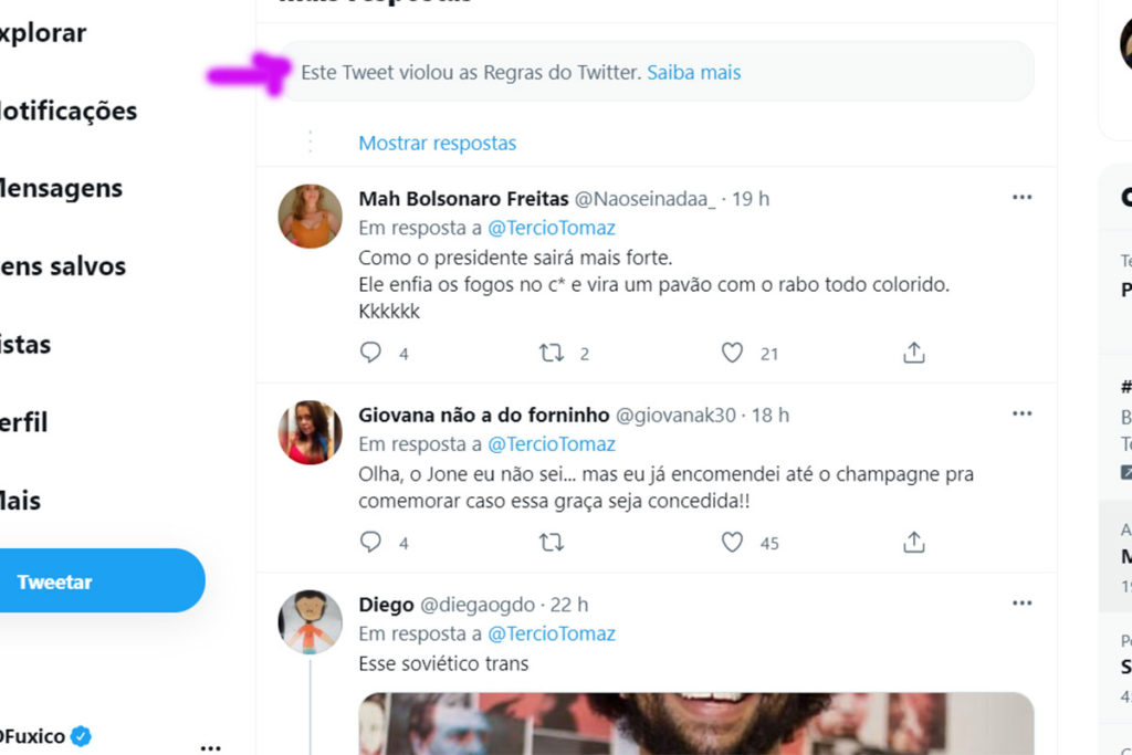 Essa resposta agora foi excluída pelo Twitter e no lugar da frase está um aviso: “este tuíte violou as regras do Twitter”.