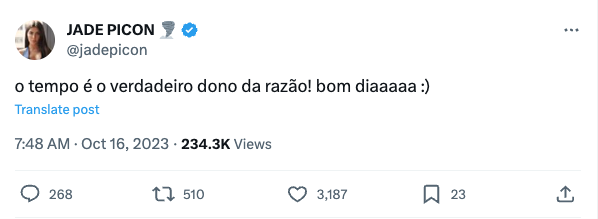 Jade Picon não ficou calada e também mandou um suposto recado à modelo. “O tempo é o verdadeiro dono da razão! Bom diaaaaa”, escreveu a atriz na mesma rede social.