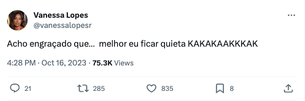 Nesta terça-feira, 17 de outubro, a influenciadora Vanessa Lopes fez um comentário que foi interpretado como indireta a Brunet em seu perfil no X, antigo Twitter. “Acho engraçado que… Melhor eu ficar quieta KAKAKAKAKA”, escreveu ela.