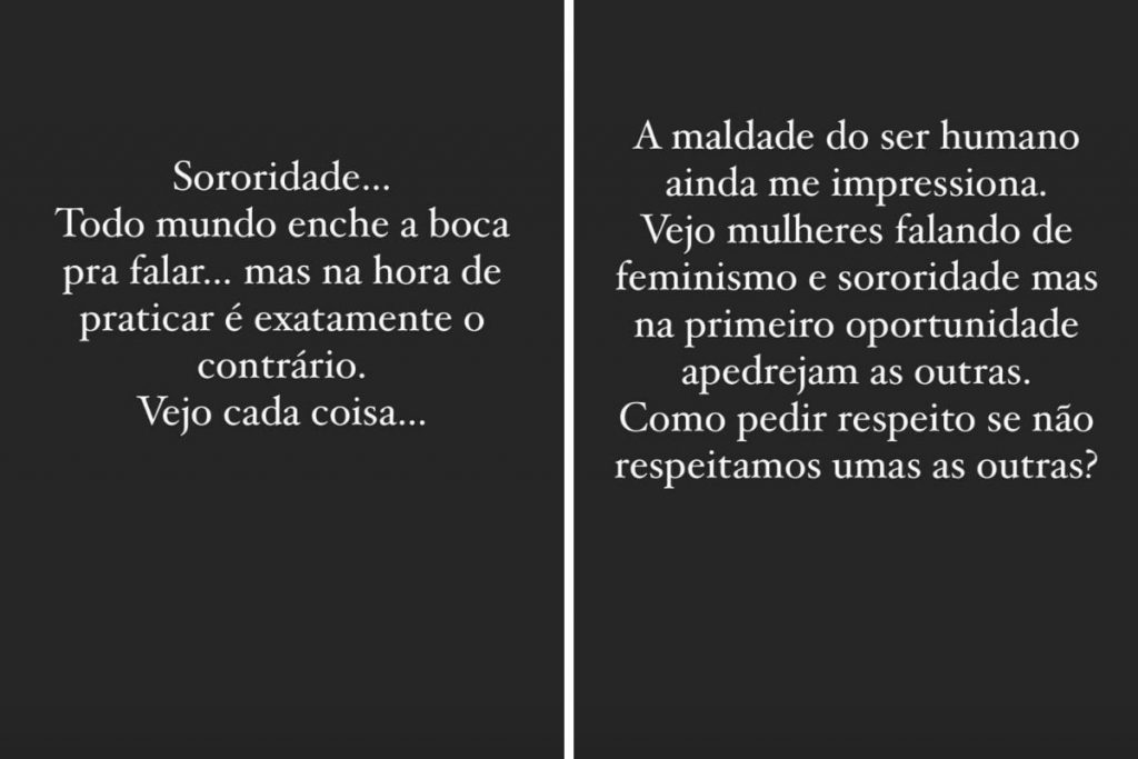 “A maldade do ser humano ainda me impressiona. Vejo mulheres falando de feminismo e sororidade, mas na primeira oportunidade apedrejam as outras. Como pedir respeito se não respeitamos umas às outras?”, questionou.