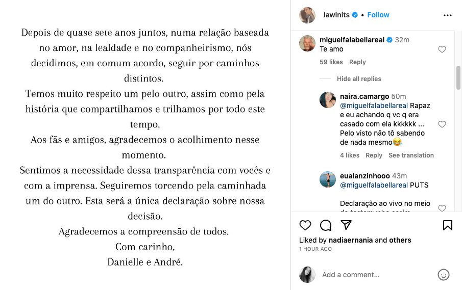 “Depois de quase sete anos juntos, numa relação baseada no amor, na lealdade e no companheirismo, nós decidimos, em comum acordo, seguir por caminhos distintos. Temos muito respeito um pelo outro, assim como pela história que compartilhamos e trilhamos por todo este tempo”