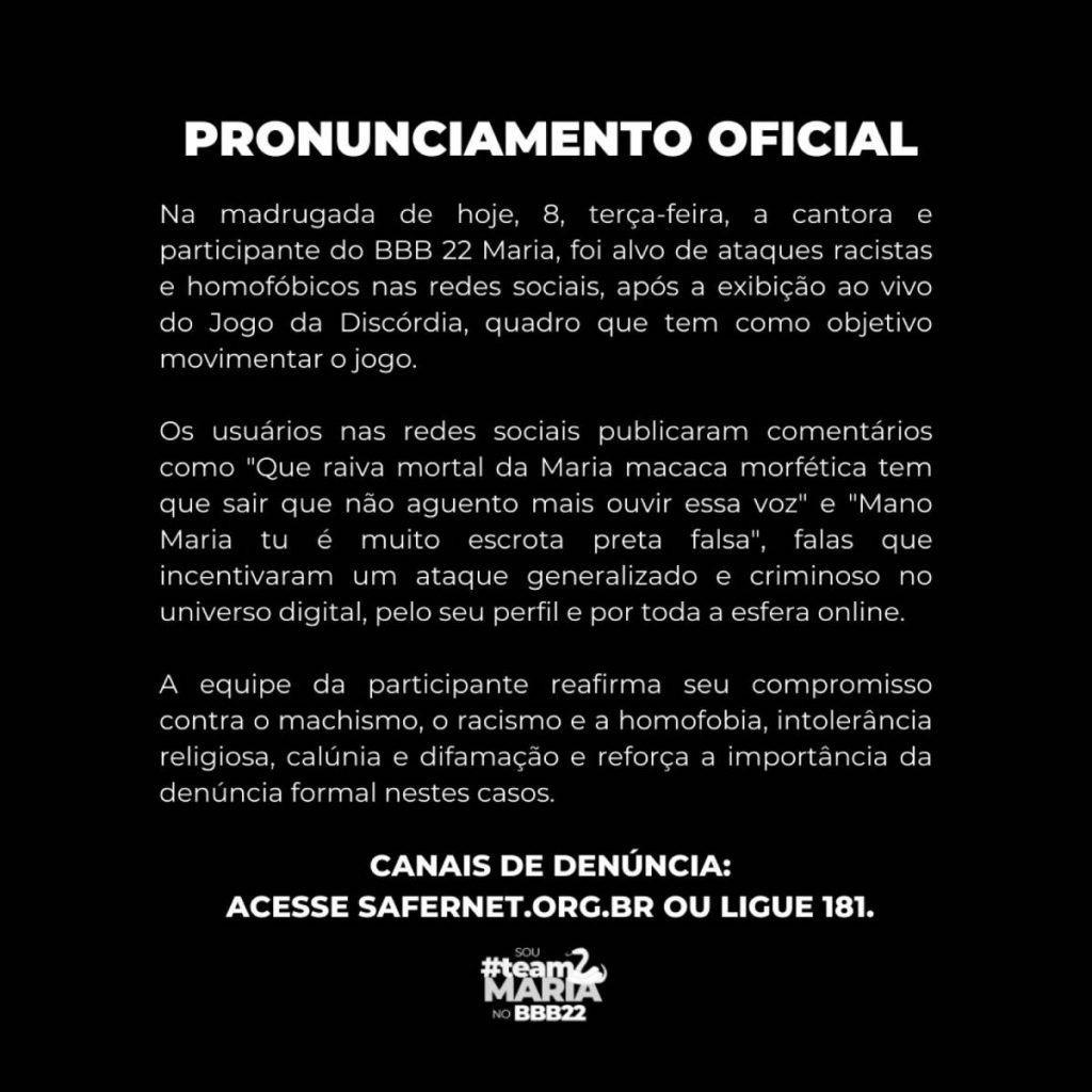 “Na madrugada de hoje, 8, terça-feira, a cantora e participante do BBB 22 Maria, foi alvo de ataques racistas e homofóbicos nas redes sociais, após a exibição ao vivo do Jogo da Discórdia, quadro que tem como objetivo movimentar o jogo”, iniciou o comunicado.