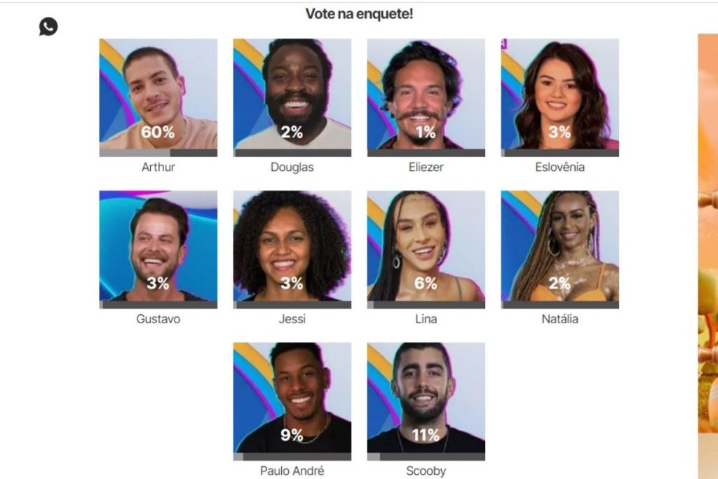 O menos votado pelo público para vencer o programa é Eliezer, que tem apenas 1%.