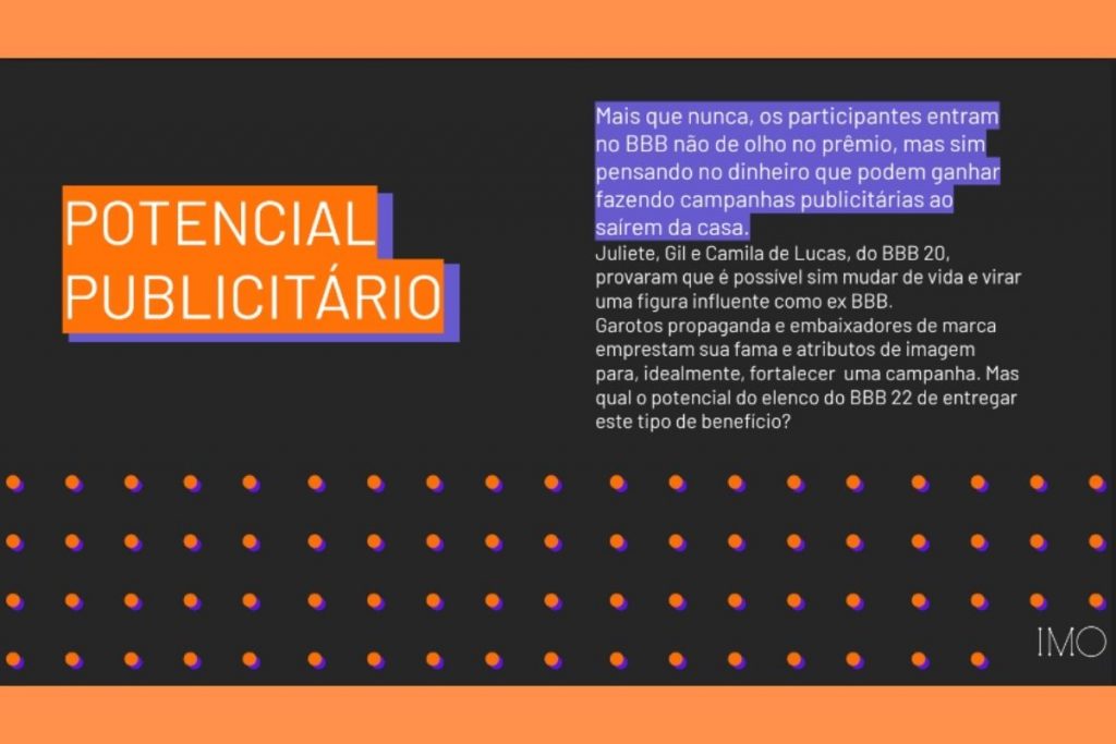 “Este estudo é feito nos mesmos moldes de um ‘Brand Tracking’ feito para a indústria. O público estudado é composto por quem acompanha BBB de alguma forma, seja na TV, redes sociais ou portais de cultura pop”, explicou a empresa. “A amostra é composta de 210 entrevistas semanais, para compor um mês com aproximadamente 900 pessoas entrevistadas.”
