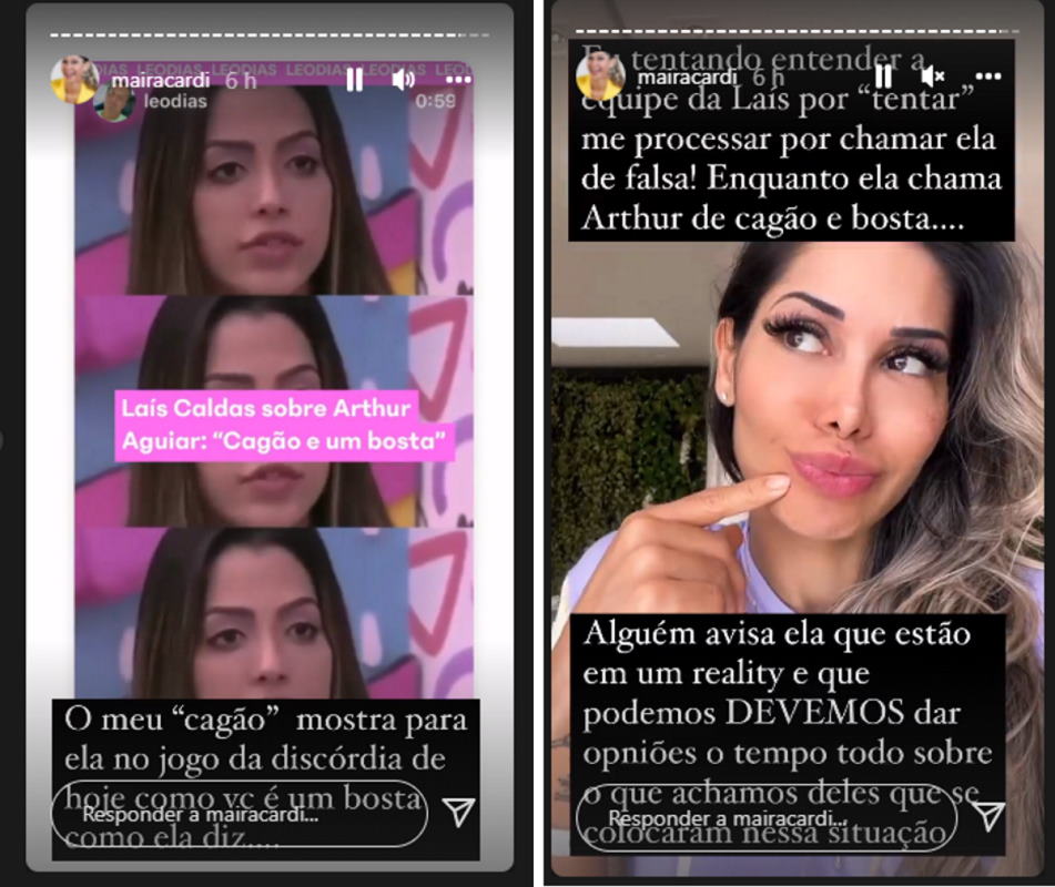 Pelo Instagram, a influenciadora chegou a publicar um vídeo de Laís falando de Arthur de maneira desrespeitosa e escreveu: “Eu tentando entender a equipe da Laís por ‘tentar’ me processar por chamar ela de falsa enquanto ela chama Arthur de ‘cagão’ e ‘bosta.'” Ela ainda completou: “Alguém avisa ela que estão em um reality e que devemos dar opiniões o tempo todo sobre o que achamos deles, que se colocaram nessa situação?”