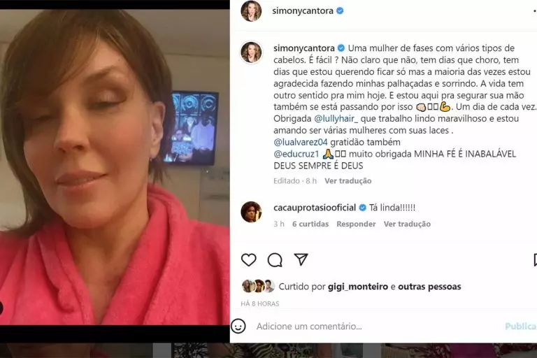 Na noite de quarta-feira, 24 de agosto, Simony foi às suas redes sociais, mostrar mais um estilo de cabelo diferente. Após a descoberta de um câncer no intestino e de iniciar os tratamentos de quimioterapia, que fazem, geralmente, os cabelos caírem muito, a cantora contou em seus stories que suas madeixas não estão mais fartas como antes.