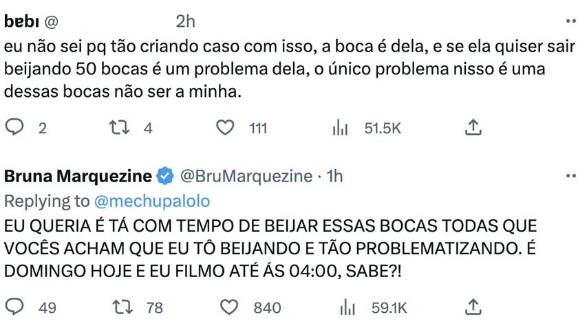 “Eu não sei porque tão criando caso com isso, a boca é dela, e se ela quiser sair beijando 50 bocas é um problema dela, o único problema nisso é uma dessas bocas não ser a minha”, escreveu uma seguidora.