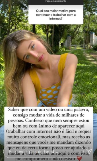Duda foi questionada por de seus seguidores o motivo de ainda não ter desistido: “Qual o seu maior motivo para continuar a trabalhar com a internet?”, perguntou o fã.