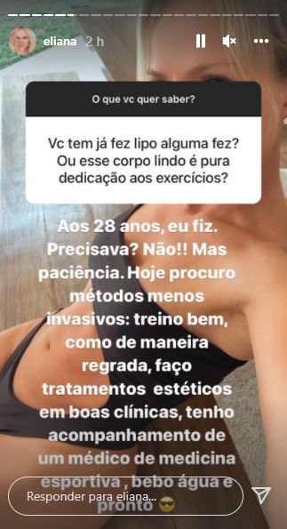 Por essa os 28,9 milhões de seguidores de Eliana não esperavam. A apresentadora de 48 anos compartilhou uma foto de maiô em seus stories, no Instagram, na terça-feira, 04 de janeiro, e respondeu a algumas curiosidades dos fãs. A loira, que costuma manter a vida pessoal afastada dos holofotes, teve um momento mais aberto com os seguidores. Questionada se já fez lipoaspiração ou se sua boa forma era fruto de exercícios, ela revelou que já se submeteu ao procedimento há 20 anos e se arrepende.