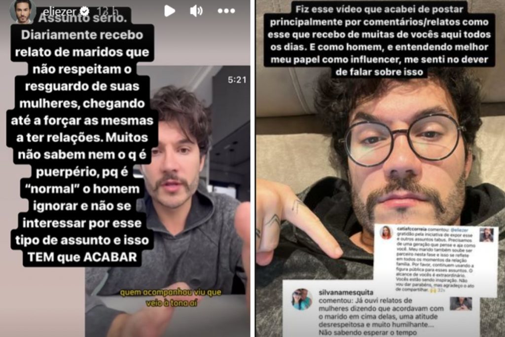 Eliezer pontuou ainda que é preciso respeitar a fase e não cobrar nem ameaçar a mulher. “A mulher não precisa de um cara cobrando sexo o tempo todo ‘Não vai fazer sexo comigo?’, ‘Já tem quarenta dias que não faz sexo comigo’. Não é isso! Respeitar o tempo da sua mulher não te faz menos homem. Não te torna fraco. Não te torna ‘frouxo’. Te torna, minimamente, um homem de caráter.”
