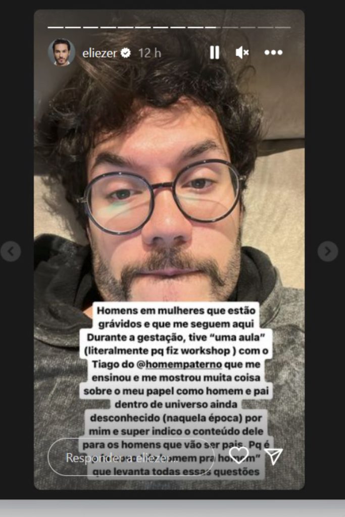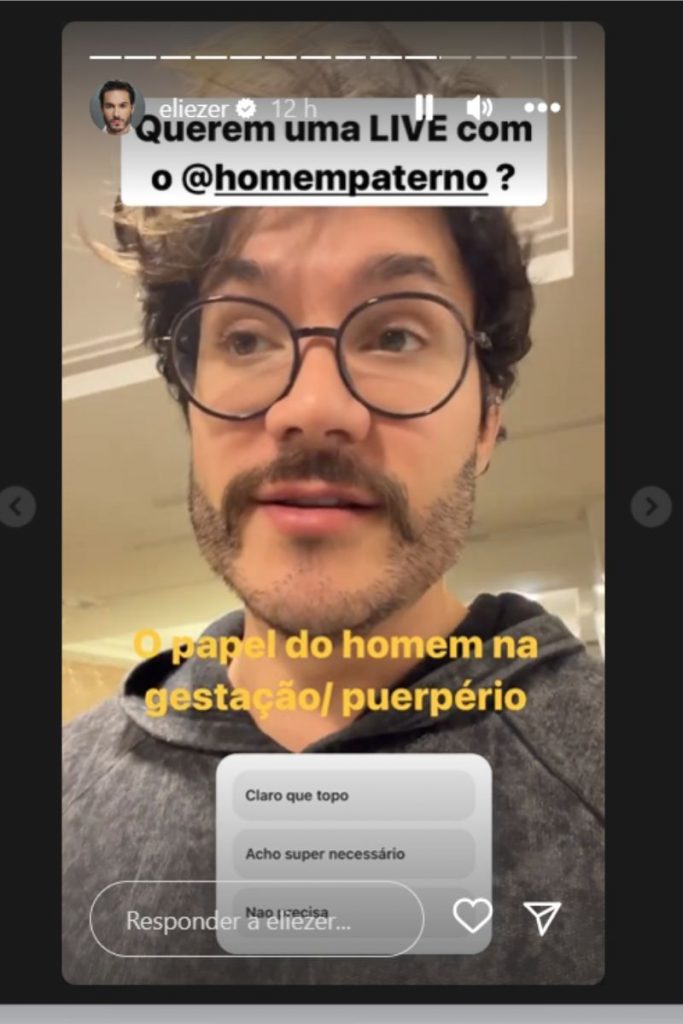 Nos Stories, Eliezer ainda fez uma enquete para saber se existe a vontade de todos sobre uma live onde Tiago, da página @homempaterno, conversará com os seguidores sobre o papel do homem na gestação e no puerpério.