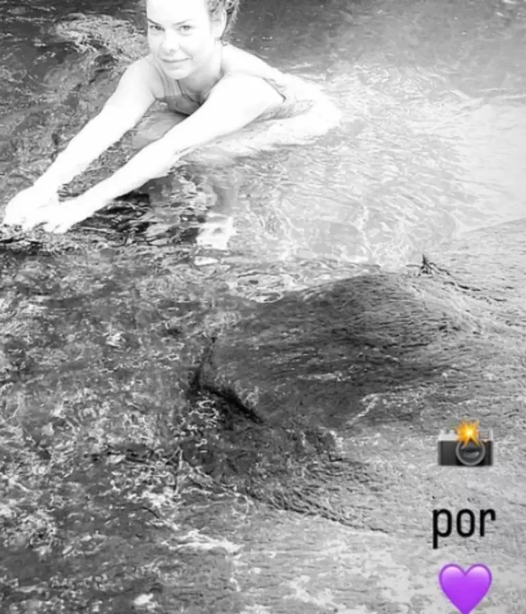 Fernanda Souza mostrou aos seguidores nas redes sociais uma foto dela em uma cachoeira. Pela imagem, a atriz dá a entender que o clique foi feito pela namorada, Duda Porto, pois ela adicionou a figura um emoji de câmera e um de coração junto a imagem.