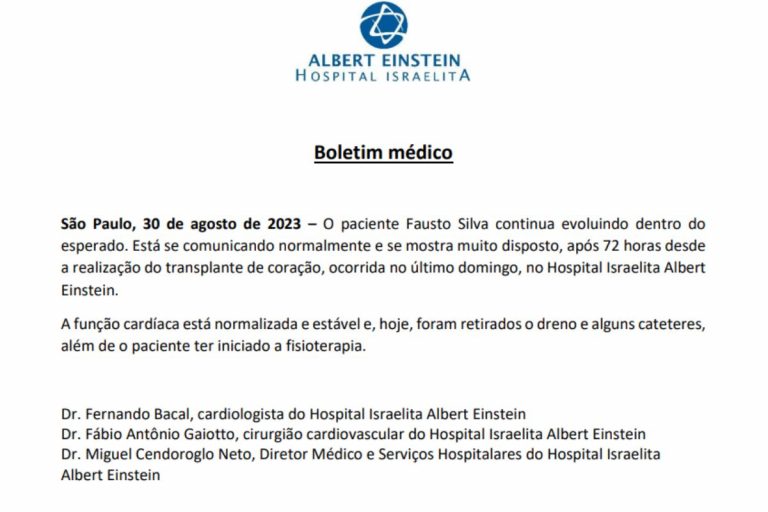 Em nota, o Hospital Albert Einsten, contou que ele já está fazendo fisioterapia e que seu quadro de saúde é estável: