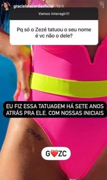 É o amooooooor… ao interagir com seus seguidores na sexta-feira, dia 02 de julho, Graciele Lacerda ousou mais uma vez. A influenciadora digital foi questionada se havia retribuído o desenho que Zezé Di Camargo fez para ela, no corpo. Em fevereiro deste ano, o irmão e parceiro musical de Luciano tatuou o nome da amada no braço. Ao responder, a morena mostrou uma tatuagem antiga que fez em sua virilha em homenagem ao cantor sertanejo. Graciele Lacerda detalhou que o desenho na parte íntima tem as inicias do casal.