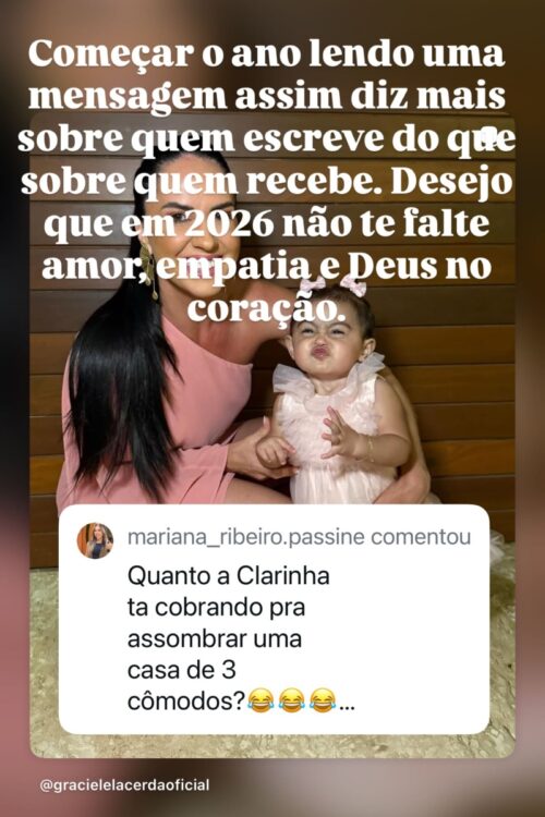 Ao rebater a mensagem, Graciele publicou o texto original e, logo depois, respondeu com firmeza. “Começar o ano lendo uma mensagem assim diz mais sobre quem escreve do que sobre quem recebe. Desejo que em 2026 não te falte amor, empatia e Deus no coração”, escreveu.