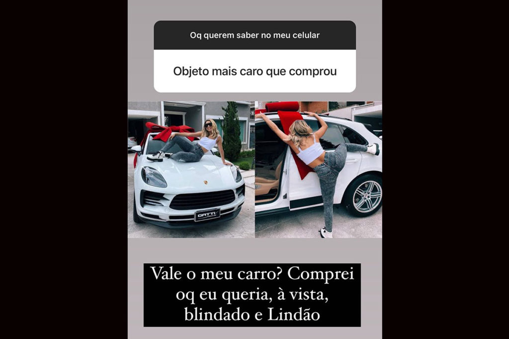 “Vale o meu carro? Comprei o que eu queria, à vista, blindado e lindão”, disse ela. A artista adquiriu um Porsche Macan em dezembro de 2020.