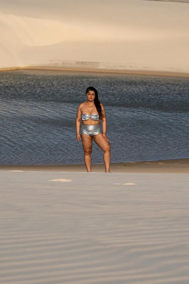 Em uma sequência de fotos de biquíni, feitas por Eduardo Paduan, apontado como affair da artista, ela esbanja alto astral ao posar pelas areias da região a bordo de um biquíni metalizado, com top e hot pants.