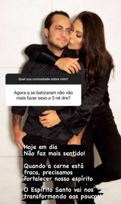 A revelação foi feita por Andressa no Instagram, ao ser perguntada sobre o assunto, agora que eles se tornaram evangélicos.