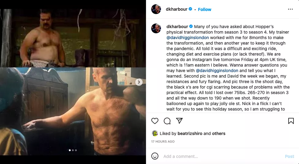 Seguindo o post, Harbour contou sobre o período de oito meses de treinos para perder peso para a quarta temporada de “Stranger Things”: