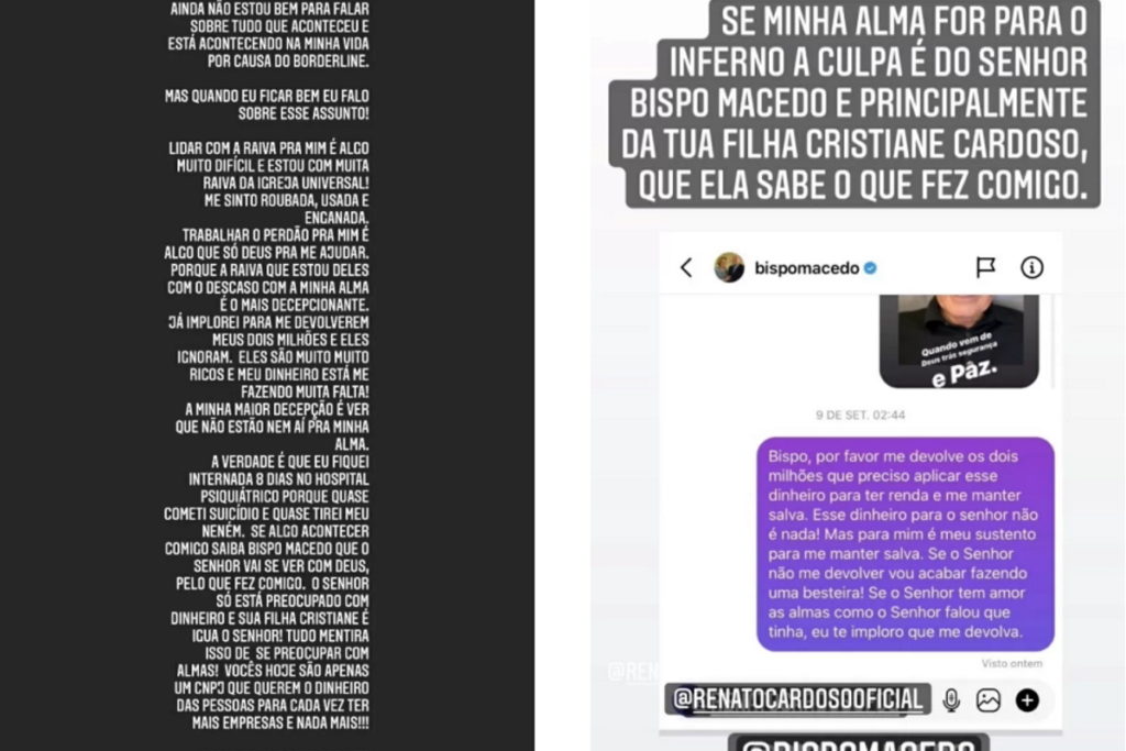 “Ainda não estou pronta para falar sobre tudo o que está acontecendo na minha vida por causa do borderline. Mas quando eu ficar bem, eu falo sobre esse assunto. Lidar com a raiva para mim é algo muito difícil e estou com muita raiva da Igreja Universal! Me sinto roubada, usada e enganada. Trabalhar o perdão para mim é algo que só Deus para me ajudar. Porque a raiva que estou deles com o descaso com a minha alma é o mais decepcionante. Já implorei para me devolverem meus R$ 2 milhões e eles ignoram. Eles são muito ricos e o dinheiro está me fazendo muita falta”, disse a modelo.