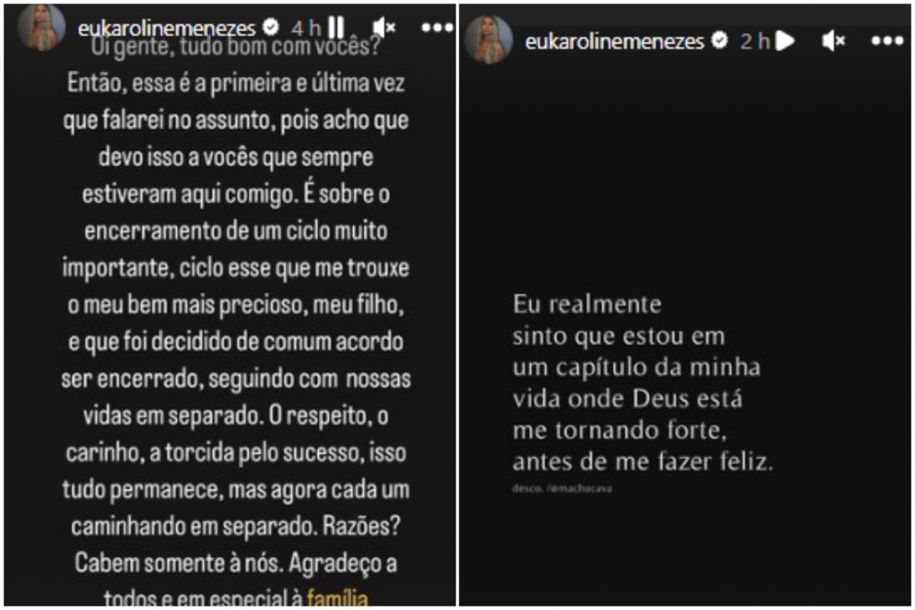 Karoline, que é influenciadora e empresária, da mesma forma se manifestou na redes, no entanto, de maneira um pouco mais longa. “Essa é a primeira e última vez que falarei no assunto, pois acho que devo isso a vocês que sempre estiveram aqui comigo”, começou.