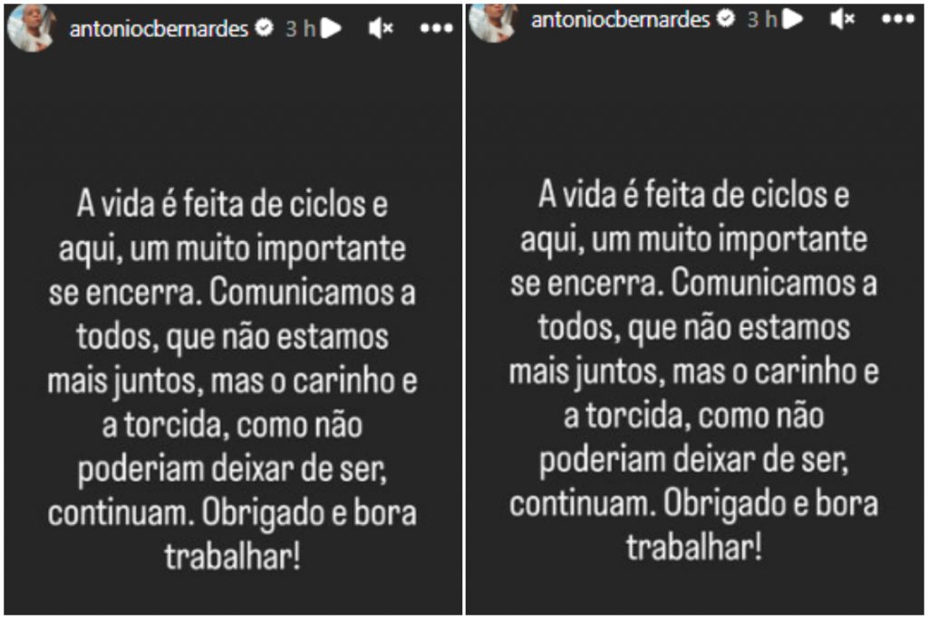 O ator Antônio Carlos, que ficou conhecido por ser filho do humorista Mussum, de “Os Trapalhões”, foi econômico em suas palavras. “A vida é feita de ciclos e aqui um muito importante se encerra. Comunicamos a todos que não estamos mais juntos, mas o carinho e a torcida, como não poderiam deixar de ser, continuam. Obrigado”, escreveu e compartilhou no story do Instagram.