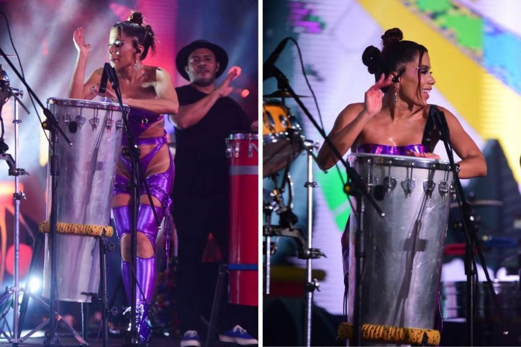 Anitta toca percussão durante show em São Paulo. Foto: Leo Franco/AgNews
