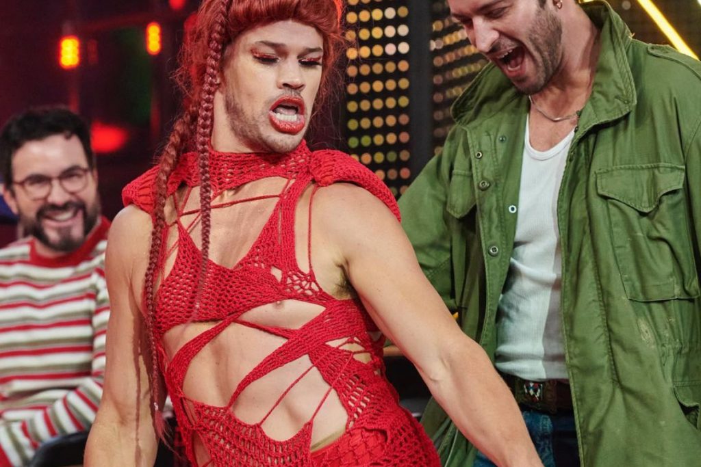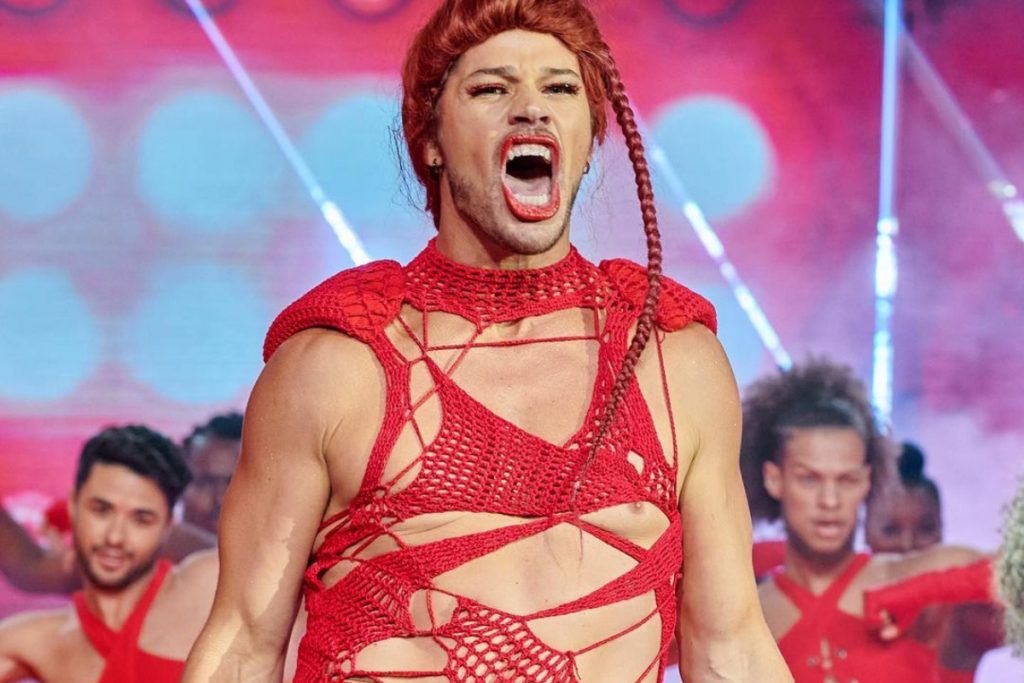 A bordo de um look vermelho, peruca e muito batom nos lábios, o ator deu um show de interpretação, ganhando até elogios da própria cantora. “Mozão quebrou tudo.”