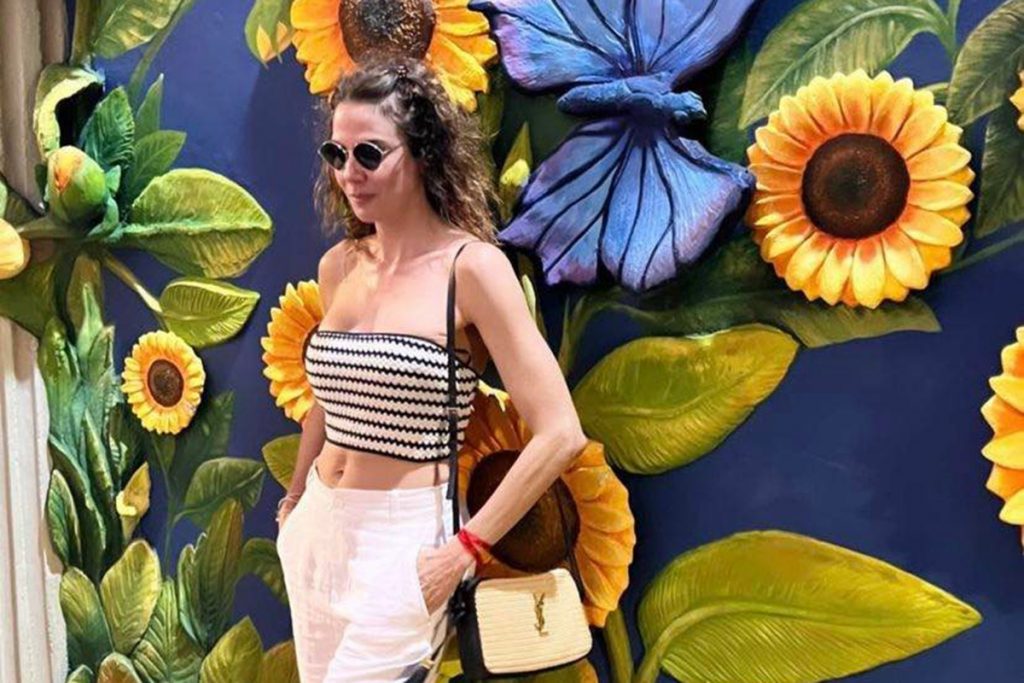 Fazendo poses de frente e de costas em um muro repleto de girassóis, a artista brasileira deu um show de boa forma e autoestima ao completar a produção com um óculos de sol redondo no estilo anos 90 e uma sandália de tiras com detalhes dourados.