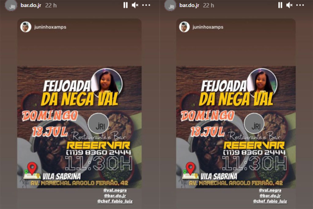 Ainda na atração da Record TV, Dona Val informou que voltou a trabalhar vendendo feijoada, em um restaurante localizado no bairro de Vila Sabrina, na Zona Norte da capital paulista. O estabelecimento Bar do JR! (@bar.do.jr) pertence a um dos amigos do artista, que morreu ao cair da sacada de um luxuoso hotel carioca.