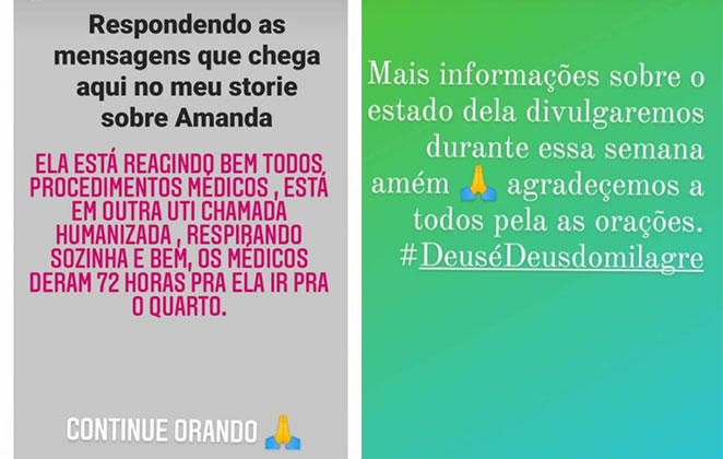 "Mais informações sobre o estado de saúde dela divulgaremos durante essa semana. Amém! Agradecemos a todos pelas orações #DeuséDeusdomilagre. Respondendo às mensagens que chegam aqui nos meus stories sobre a Amanda, ela está reagindo bem a todos os procedimentos médicos, está em outra UTI, chamada humanizada, respirando sozinha e bem. Os médicos deram 72 horas para ela ir para o quarto. Continue orando", afirmam os posts nas redes sociais da artista.