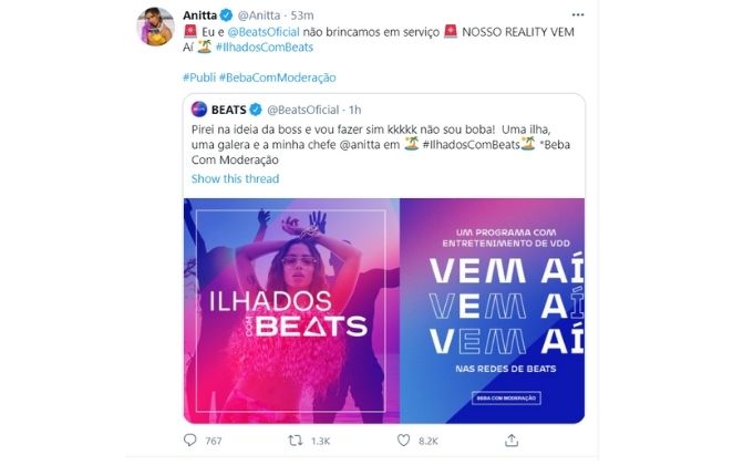 Em tweets recentes, a artista brincou com a situação de alguns participantes do Big Brother e até insinuou que eles estariam convidados para a ilha, citando por exemplo o emparedado dessa semana, Arcrebiano. O nome do programa irá ser Ilhados com Beats.