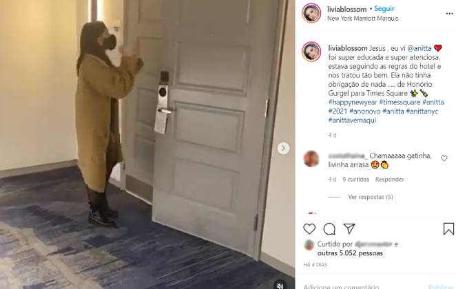 "Jesus , eu vi @anitta. Foi super educada e super atenciosa, estava seguindo as regras do hotel e nos tratou tão bem. Ela não tinha obrigação de nada ….. de Honório Gurgel para Times Square.", escreveu a fã na legenda da publicação em que postou o vídeo ao ser atentida por Anitta.