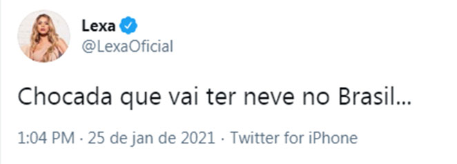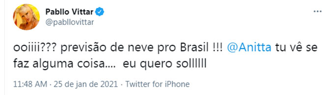 Além do BBB21, Anitta foi um dos assuntos mais comentados na web na segunda-feira (25), depois de surgir nas redes sociais biquíni, ao lado de duas de suas dançarinas, em plena neve. A imagem logo viralizou e as hashtags #nevenobrasil e #anittafazalgumacoisa tomaram conta das redes.