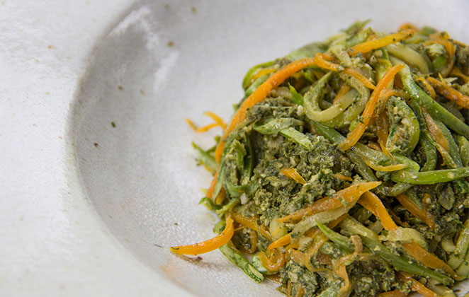 O cardápio foi macarrão de vegetais com molho pesto e folha de cenoura, suco verde e, para sobremesa, creme de manga com hortelã.