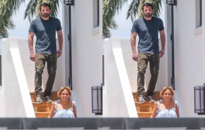 O casal foi fotografado quando estavam saindo de uma casa alugada por J Lo em Miami. Nas imagens, Jennifer aparece sorrindo descendo as escadas, enquanto Ben surge logo atrás dela.
