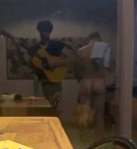 Ele acabou, sem querer, mostrando mais do que devia. Nas imagens, o outro cantor da dupla, Guto Oliveira, não percebe que o celular está gravando, e entra na frente, completamente nu, deixando seu bumbum de fora.