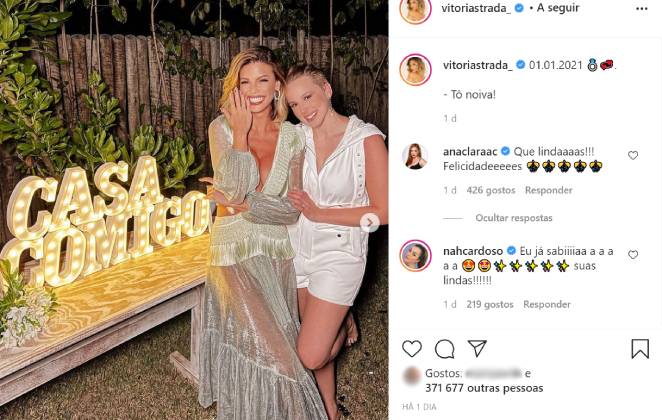 “Que lindas! Felicidades”, disparou a ex-BBB Ana Clara. “Suas lindas! Que alegria! Parabéns”, comentou Monique Alfradique. “Sua lindas! Viva o amor!”, celebrou Foquinha.