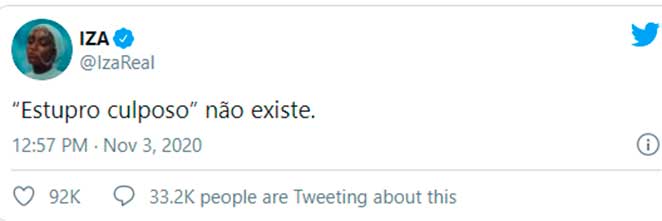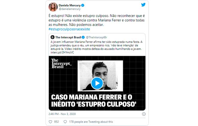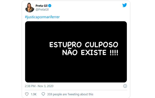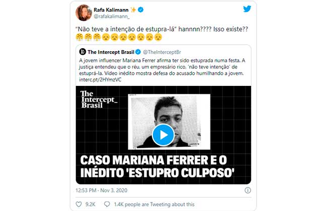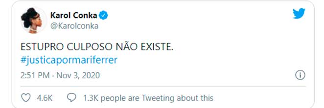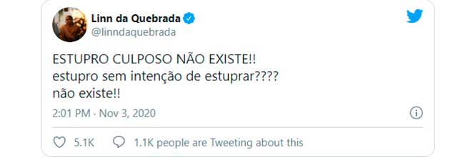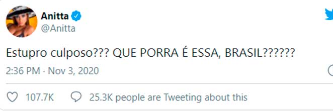 “Estupro culposo??? QUE PORRA É ESSA, BRASIL??????”, disparou Anitta. “‘Não teve a intenção de estupra-lá’ hannnn???? Isso existe??”, declarou Rafa Kalimann.