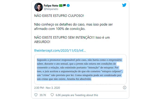 “Não conheço os detalhes do caso, mas isso pode ser afirmado com 100% de convicção: NÃO EXISTE ESTUPRO SEM INTENÇÃO”, disse Felipe Neto. “’Estupro Culposo, PQP’”, criticou Bruna Marquezine.