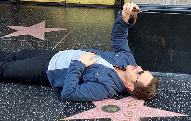 O ator mostrou que é muito gente como a gente e deitou no chão para tirar uma selfie com a sua estrela na calçada da fama.