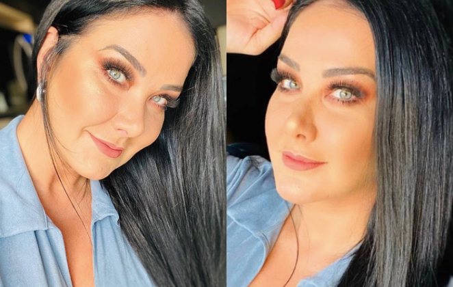 Com uma blusa azul que forma um decote bastante generoso e deixando parte do colo à mostra, a musa posou para algumas selfies toda produzida e maquiada.