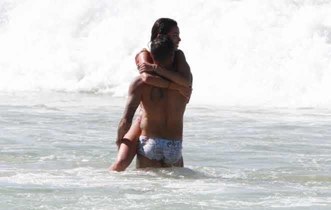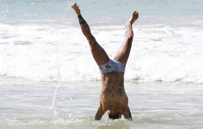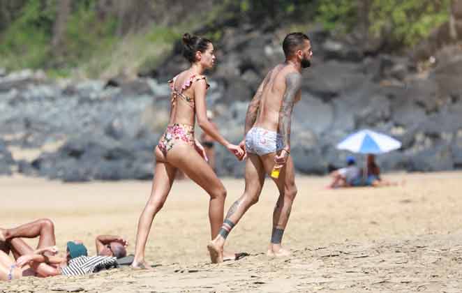 O jogador do São Paulo estava na companhia da esposa, Joana Sanz. Em um dos flagras, Dani aparece se divertindo no mar com a amada. Em outro clique, ele planta bananeira na água.
