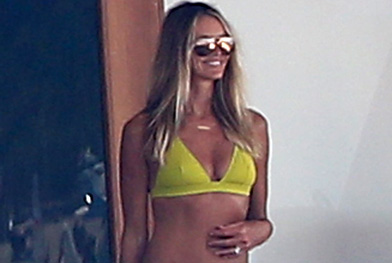 Elle MacPherson estava com um biquíni amarelo, que realçou seu corpão na companhia do marido, Jeffrey Soffer, e seus filhos, Arpad, de 17 anos, e Aurelius, de 12, ambos de seu relacionamento com o empresário Arpad Busson, com quem ficou de 1995 a 2005.