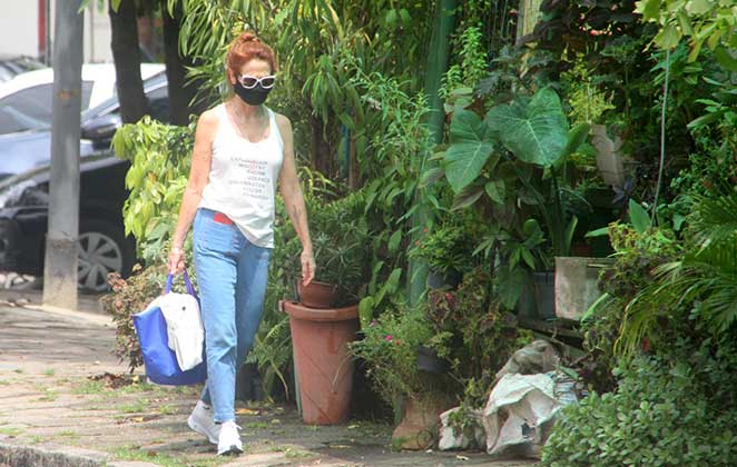 No ar na reprise especial de A Força do Querer, exibida na faixa das 21h, na Globo, a atriz de 67 anos vestiu calça jeans, tênis e regata brancos, e usou uma sacola para carregar seus pertences.
