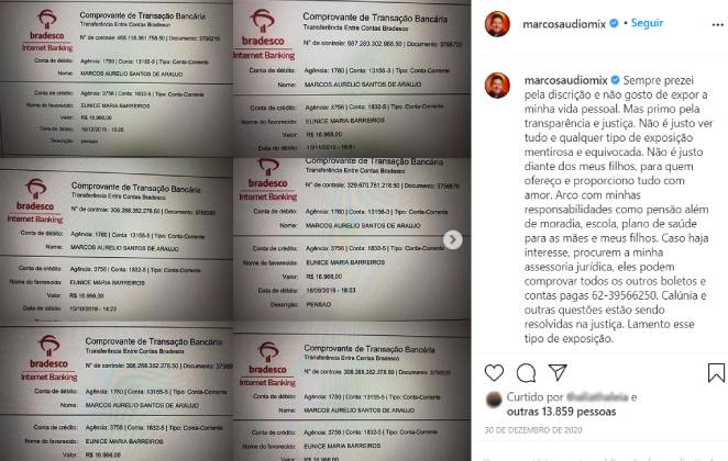 Após Barreiros expor em seus stories vídeos, fotos, prints e imagens acusando Marcos pela situação e abandono com os filhos, o empresário também tratou de compartilhar uma série de comprovantes em seu Instagram alegando arcar com suas responsabilidades paternas.