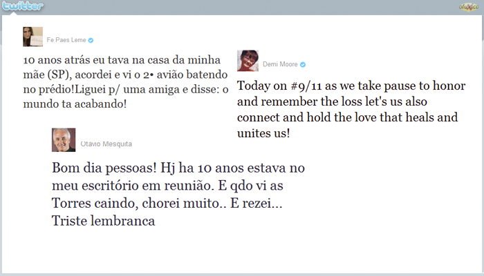 Vários artistas usaram o Twitter, neste domingo (11), para prestar suas homenagens às vítimas do atentado de 11 de setembro, nos Estados Unidos, em 2001. Alguns famosos, como Fernanda Paes Leme e Otávio Mesquita relataram onde estavam quando a tragédia aconteceu.
