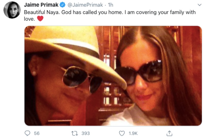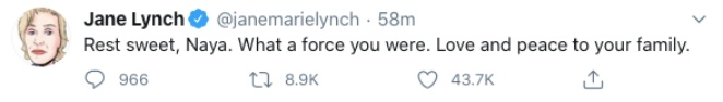 "Linda Naya. Deus chamou seu nome. Eu estou cobrindo sua família de amor", tweetou.